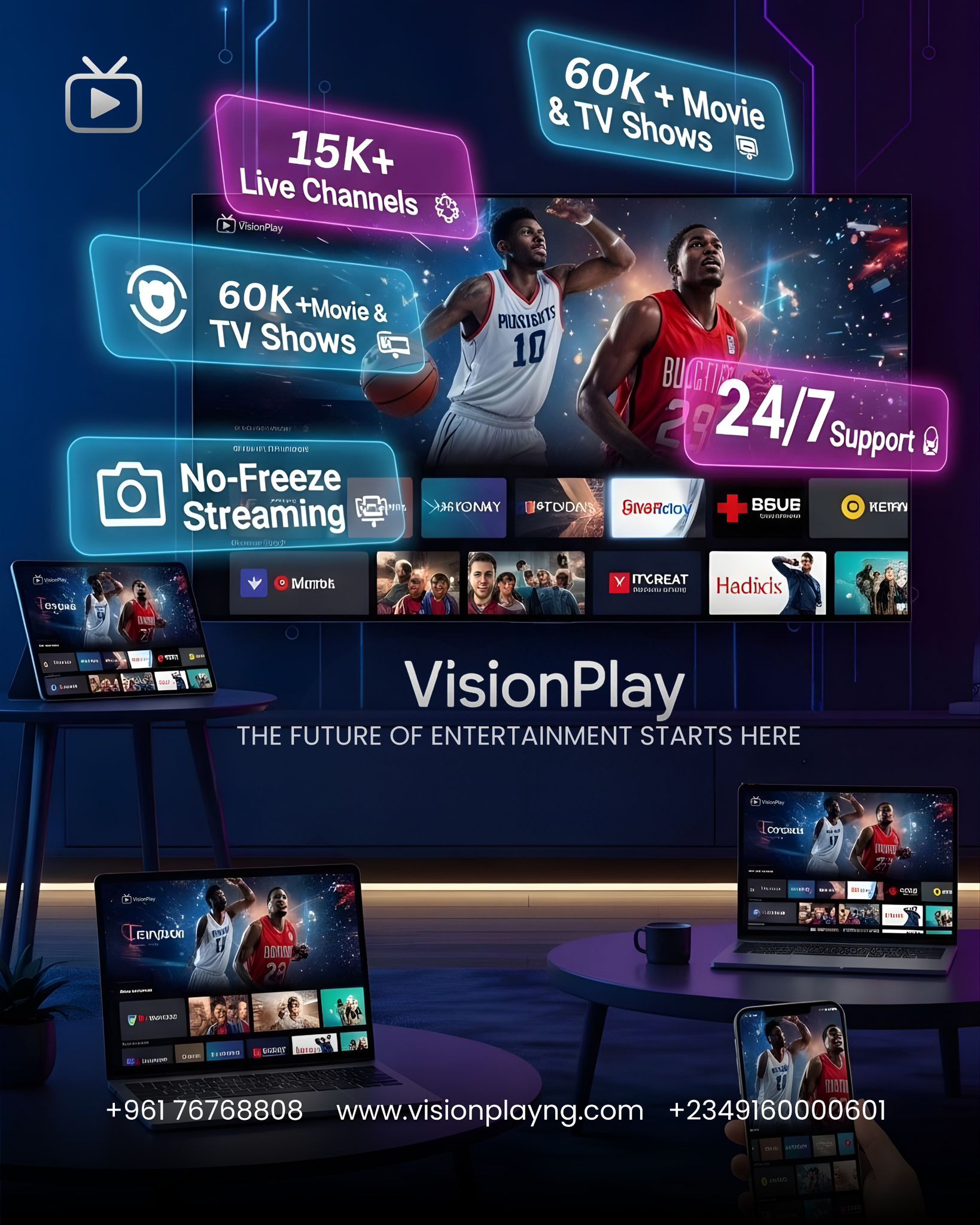 At Vision Play, we redefine entertainment. Stream live TV, movies, and sports—anytime, anywhere. Vision Play keeps you connected to the moments that matter most—at home or on the go.